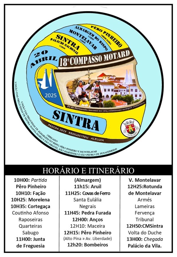 O XVIII Compasso Motard de Sintra arrancou às 10h00 de Pêro Pinheiro, seguindo depois para Fação, Morelena, Cortegaça, Coutinho Afonso, Raposeiras, Quarteiras e Sabugo. Seguiu-se a freguesia de Almargem do Bispo, com passagem por Covas de Ferro, Santa Eulália, Negrais, Pedro Furada, Anços, Maceira e Pêro Pinheiro. Depois, passagem pelos Bombeiros de Montelavar, Armés, Lameiras, Fervença e Tribunal de Sintra, com passagem pela câmara, e chegada ao Terreiro Rainha Dona Amélia, junto ao Palácio Nacional da Vila de Sintra.